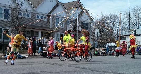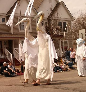 Today was a special day in South Minneapolis– the May Day Parade, an annual tradition for 39 years. The parade is a favorite— put on by the Heart of the Beast Puppet Theatre, it’s created by talented artists there working with members of the community who want to be a part of the parade. For months ahead of time, people come together to build puppets and costumes out of cardboard, paper mache, cloth and other “junk,” working together on a theme—telling a story of despair, hope and renewal and weaving in social, economic and environmental issues. The result is a festival of color and imagination, playful and joyful. I always feel good about myself and my community when I watch the May Day Parade.